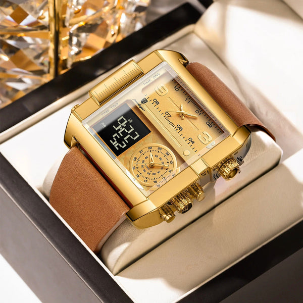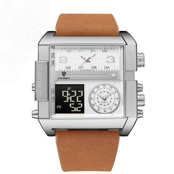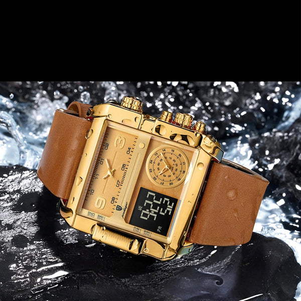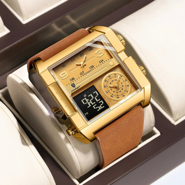 Este reloj presenta un diseño robusto y llamativo, con una caja de líneas geométricas que mezcla lo clásico con lo moderno. Integra una carátula analógica con manecillas elegantes y números marcados, complementada por una pantalla digital multifunción que añade practicidad y estilo contemporáneo.